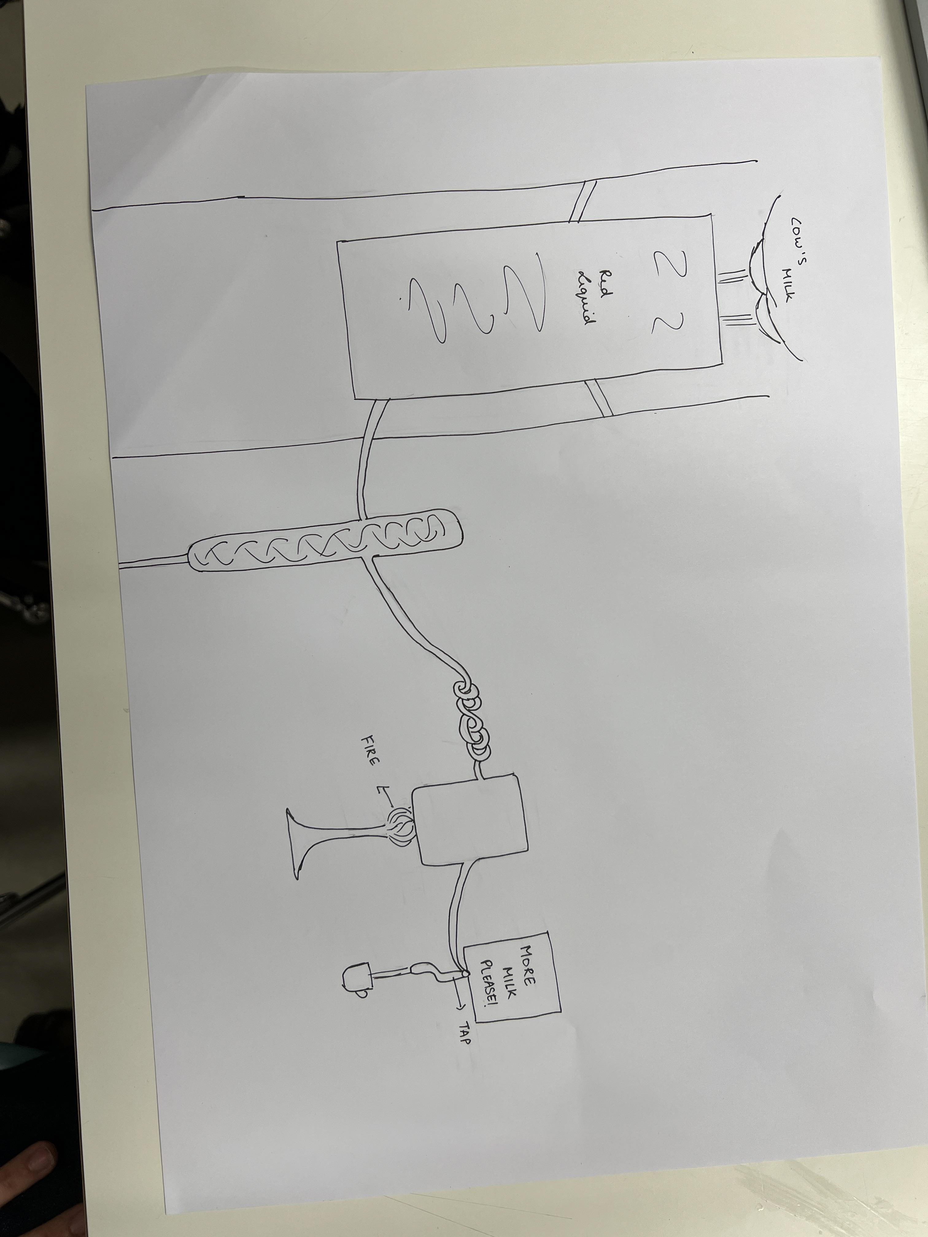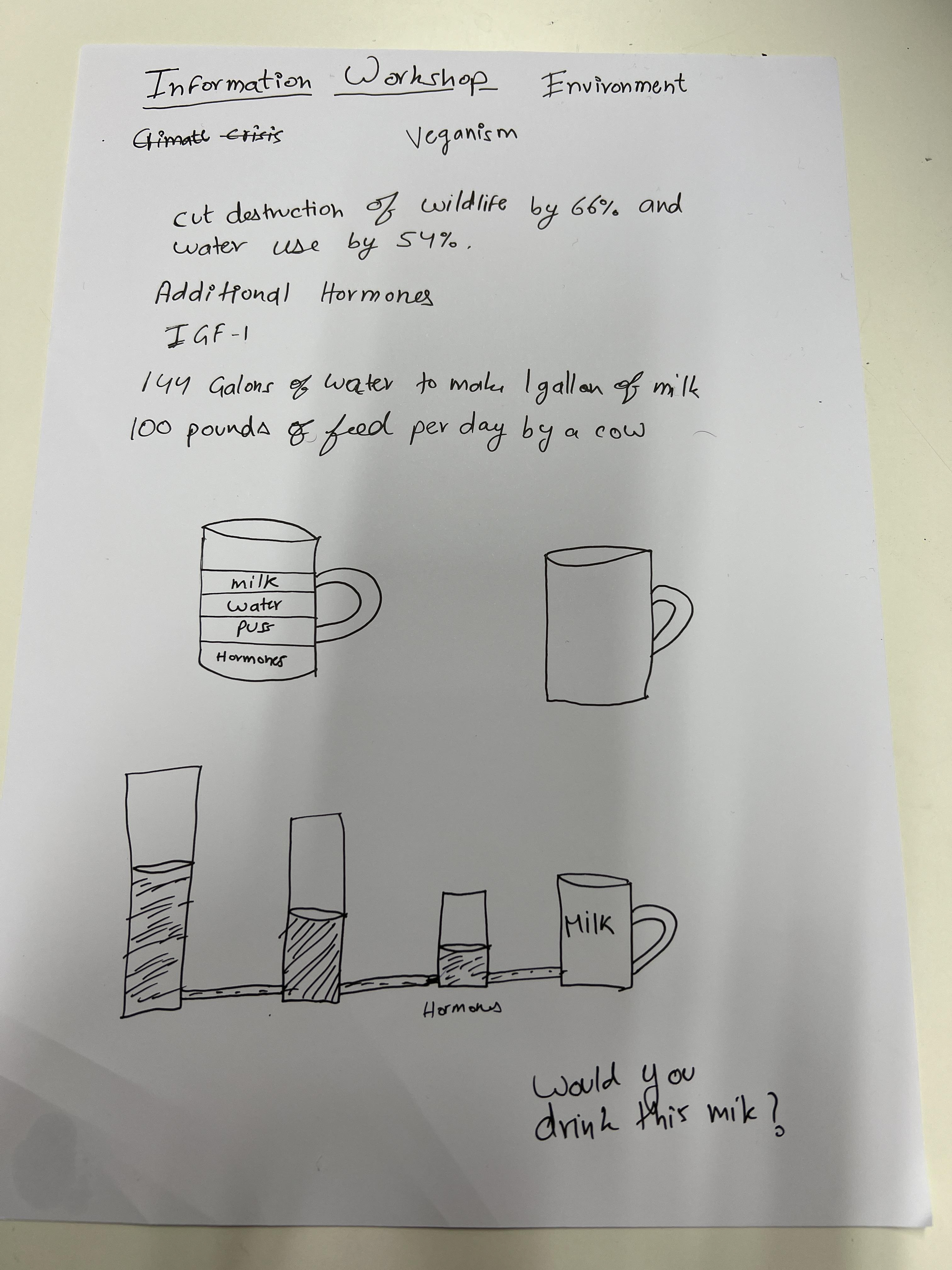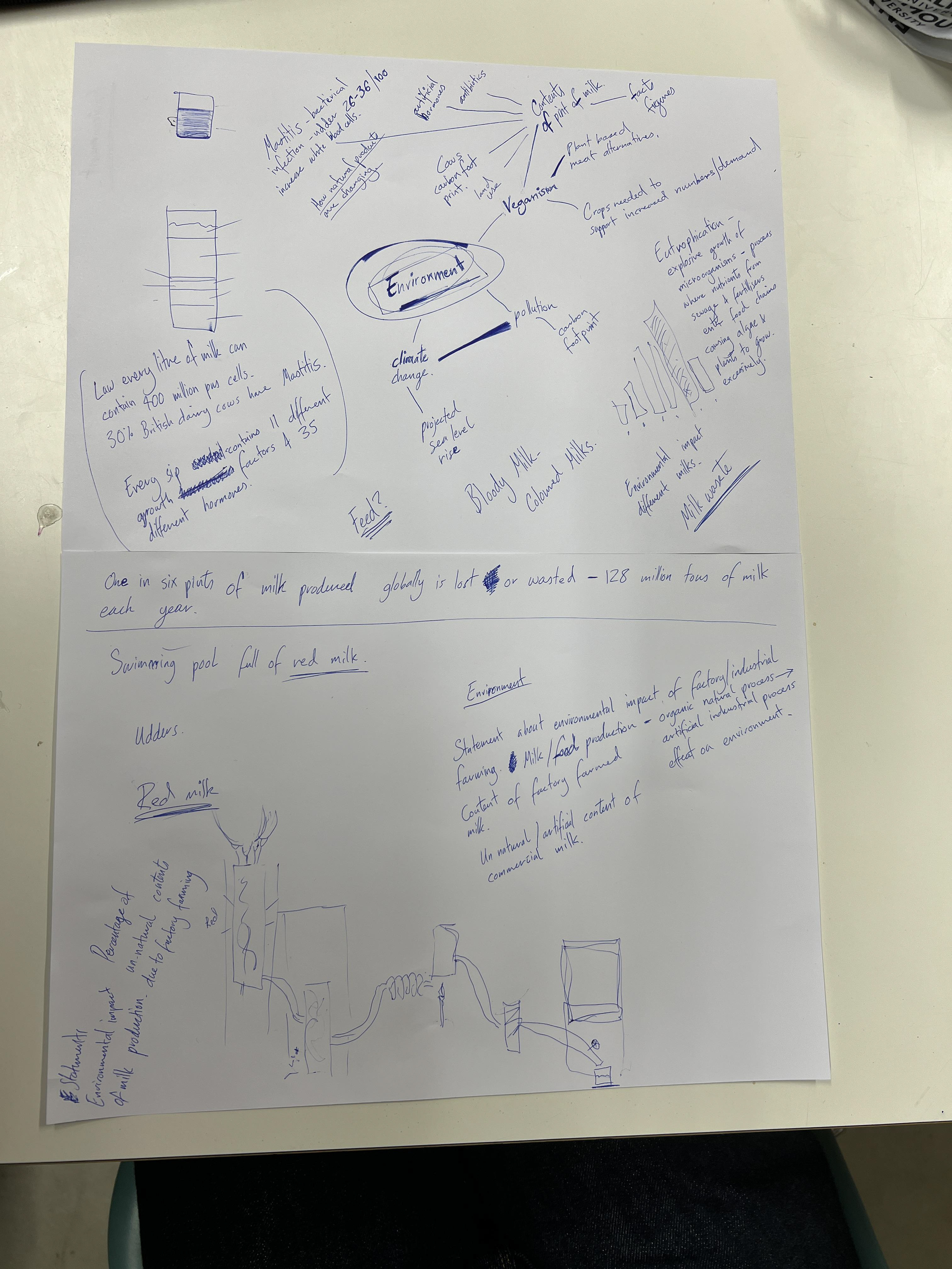 During the first day of our new module, we participated in a class exercise that involved brainstorming in groups of three. Each group was assigned a theme to explore, and ours was the environment. Our task was to identify current trends in data related to the environment. Initially, we thought of vegan and non-vegetarian foods as a topic under the environment theme. We decided to focus on milk, which is one of the most common animal-sourced items. We conducted research on the spot to learn about how milk is obtained and processed, and what kinds of chemicals and additives are used to make it available in stores today. We examined the impurities that come with it and how it is modified to be sold for profit. After our research, we were required to sketch an artefact based on the data we had collected.