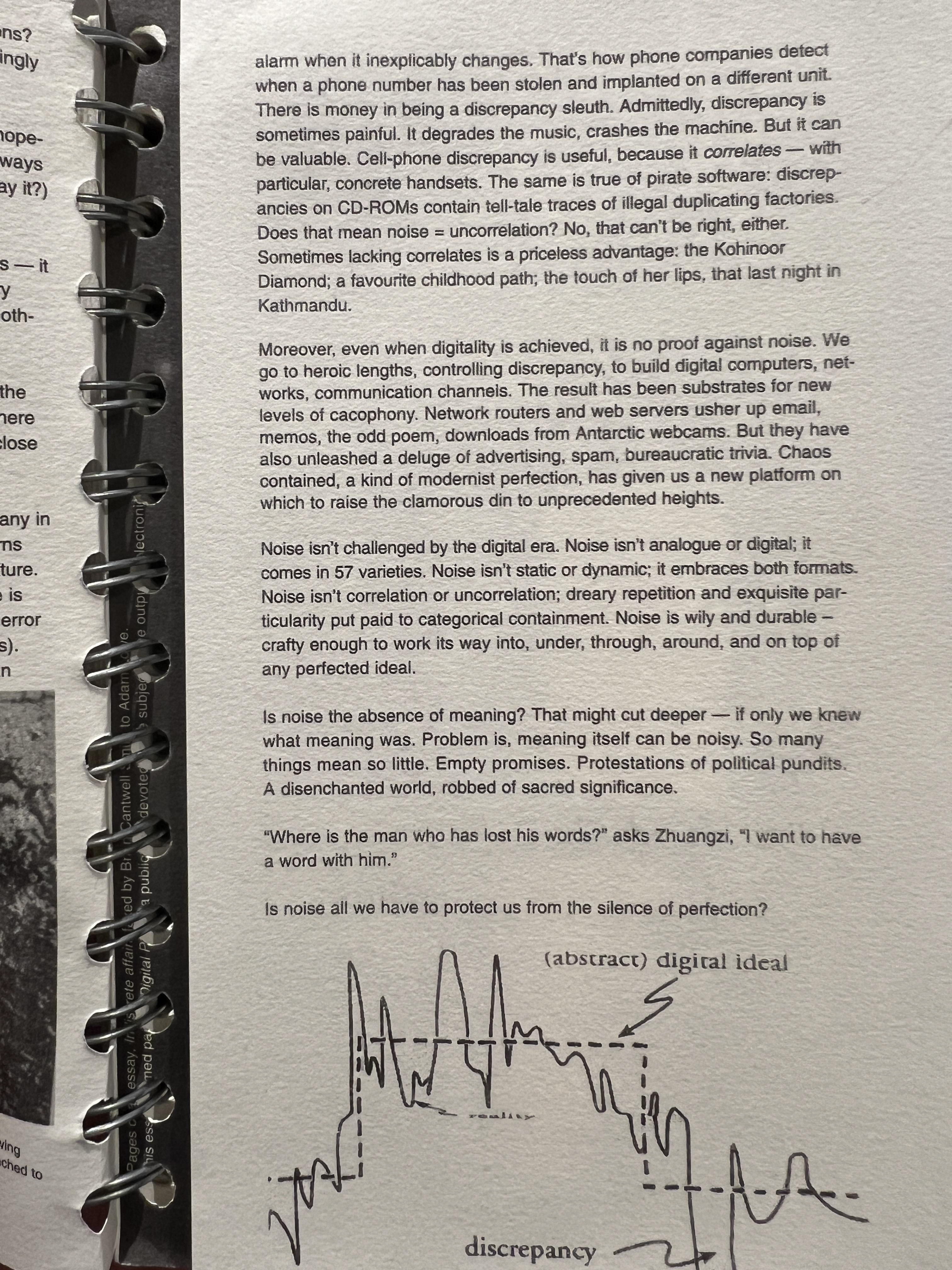 Noise isn't challenged by the digital era. Noise isn't analogue or digital; it comes in 57 varieties. Noise isn't static or dynamic; it embraces both formats. Noise isn't correlation or uncorrelation; dreary repetition and exquisite particularity put paid to categorical containment. Noise is wily and durable - crafty enough to work its way into, under, through, around, and on top of any perfected ideal.