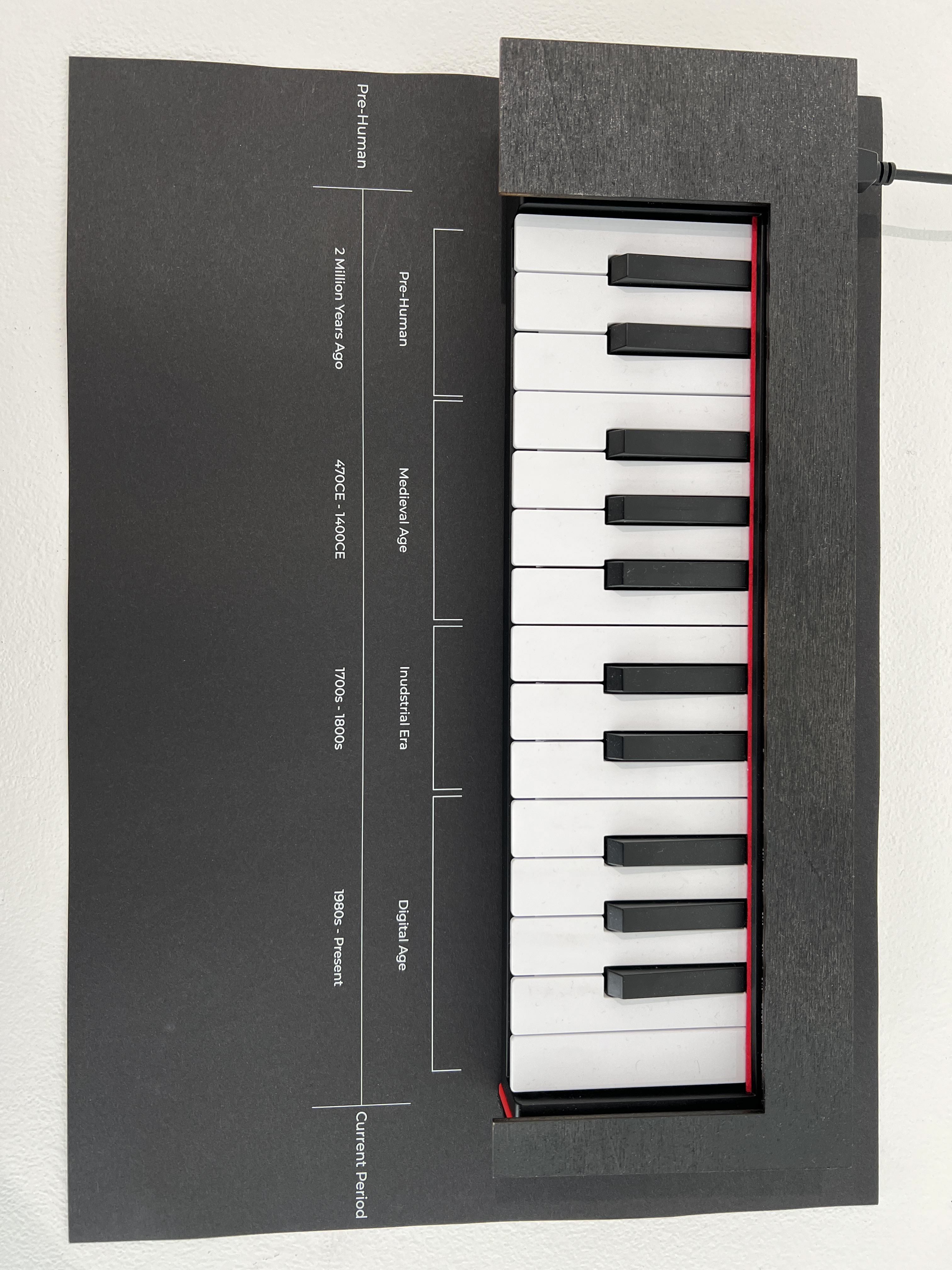 To effectively use a musical keyboard to showcase my data on the journey of sound, I realized that I could leverage the visual duality of a piano's black and white keys. This duality perfectly mirrors the contrasting nature of my data, representing sounds as both positive and negative from pre-human times to our digital age. The black and white keys of the piano provide a striking visual metaphor for the binary nature of sound, encompassing both its harmonious and disruptive qualities. By assigning positive sounds to the white keys and negative sounds to the black keys, I can create an intuitive and engaging way for the audience to interact with the data. This approach not only emphasizes the inherent contrast within the auditory landscape but also allows for a more immersive and tangible experience.