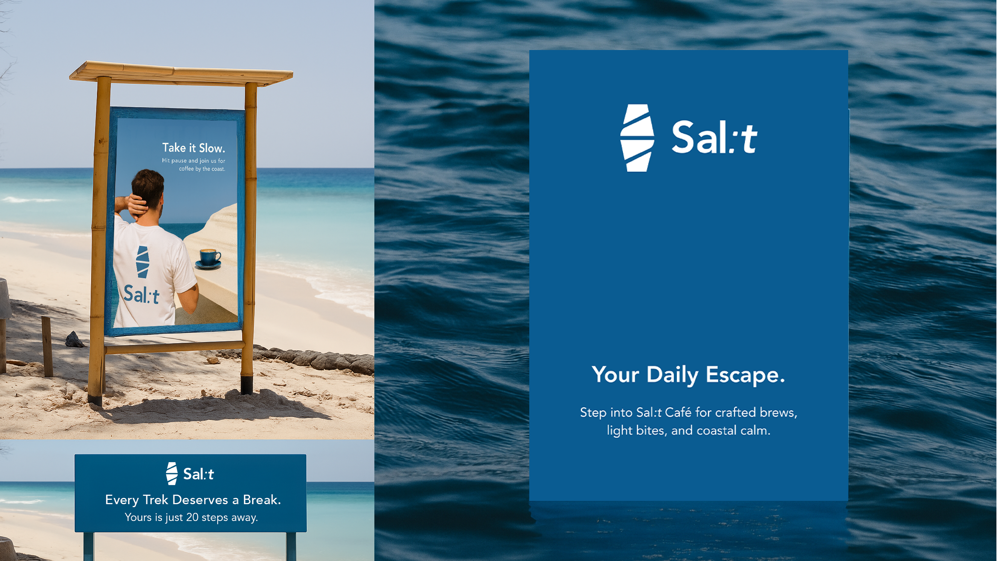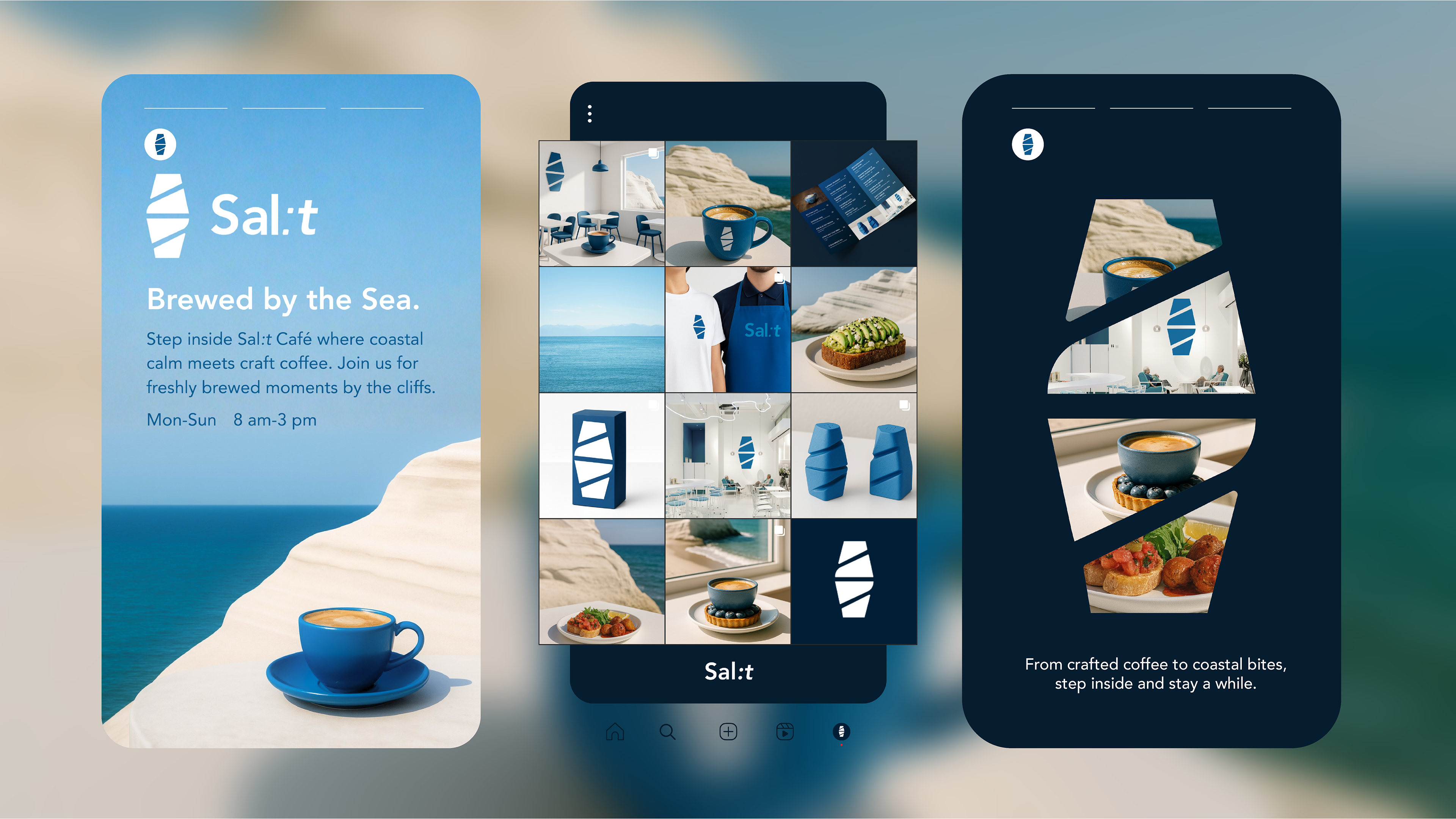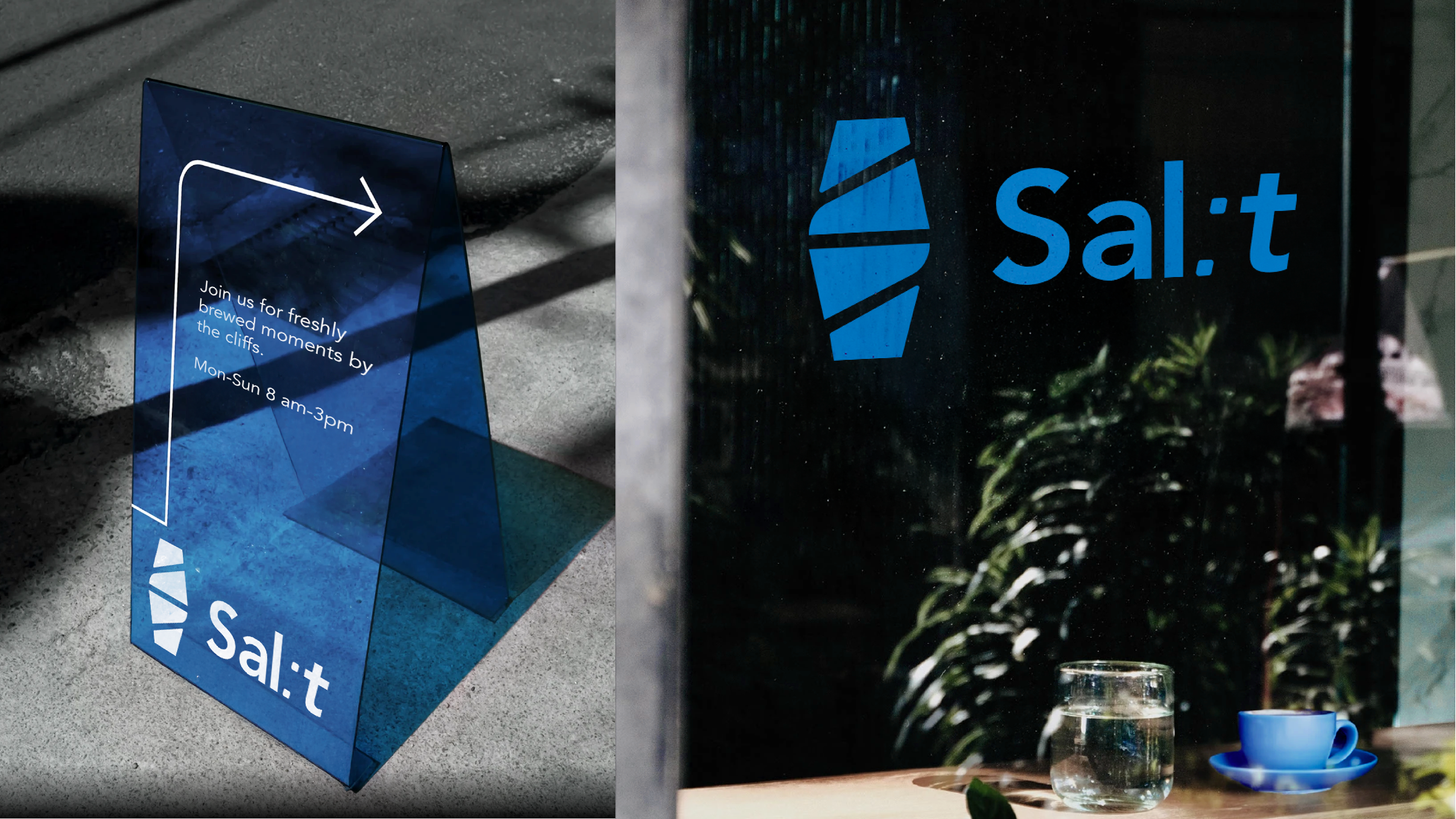 The resulting brand, Sal:t, turns the cliff’s natural form into a symbol of escape. Through its clean identity, coastal palette, and immersive storytelling, the café transforms into more than a place for food and coffee; it becomes a moment of calm and connection by the sea.